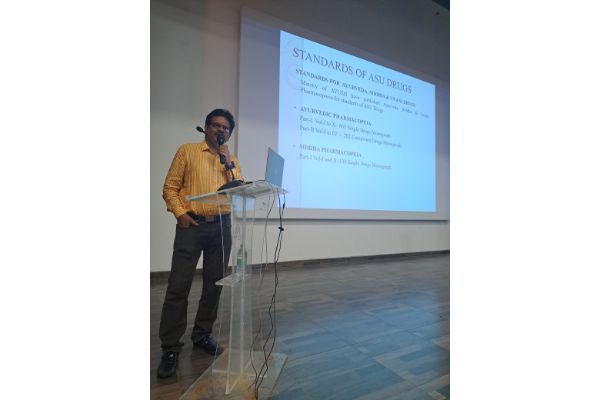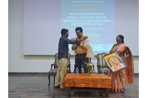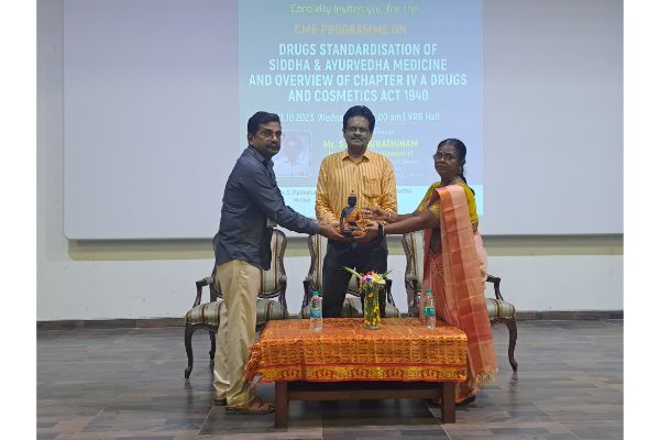 Department of Gunapadam Marunthaakaviyal organized a Continuing Medical Education (CME) on “DRUGS STANDARDISATION OF SIDDHA & AYURVEDHA MEDICINE AND OVERVIEW OF CHAPTER IV A DRUGS AND COSMETICS ACT 1940, on October 11, 2023, at VRR Hall. Our esteemed guest speaker, Mr. S MUTHURATHINAM M.A., M.Sc., M.Phil (Chemistry), Former Government Analyst / Joint Director State Drugs Testing Laboratory (Indian Medicine & Modern Medicine), Chennai,