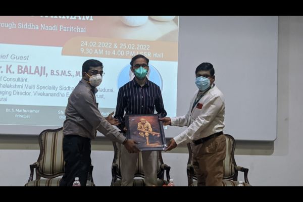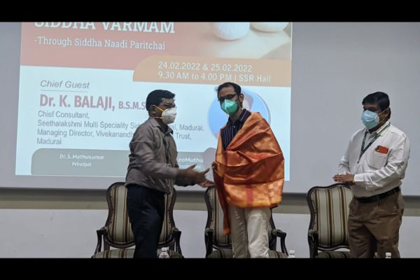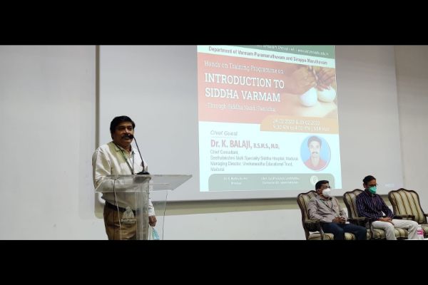 Department of Varmam Puramaruthuvam and Sirappu Maruthuvam conducted a two days Hands on Training programme on “Introduction to Siddha varmam through Siddha Naadi Paritchai” 24.02.22&25.02.22. chief Guest Dr.K.Balaji B.S.M.S MD., Chief Consultant Seethalakshmi Multi speciality Siddha Hospital, Madurai. 100 final and pre final year students and 100 CRRI participated and benefitted from the hands on training programme.