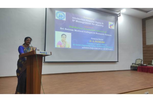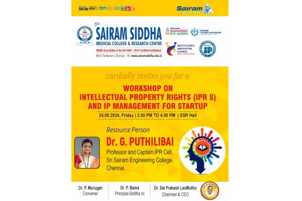 24th May 2024, Sri Sairam Siddha Medical College and Research Centre’s Institutional Innovation Council hosted a significant event featuring Dr. G. Puthilibai, Professor and Captain of Intellectual Property Rights at Sri Sairam Engineering College, delivered an informative lecture on “Intellectual Property Rights and IP Management for Startups.”