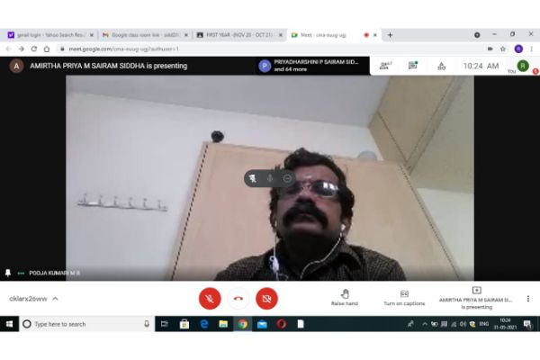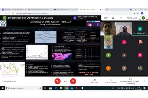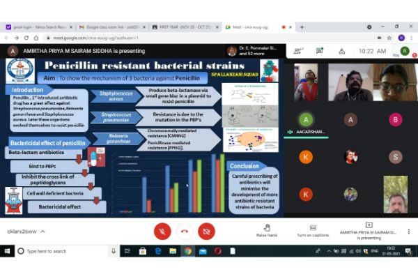 Nunnuyiriyal Conducted an E-Poster Contest on 31.05.2021 for the first year students. The topic of the poster presentation was “Emergence of Drug Resistant Strains”. 10 teams were formed and each team presented an E-Poster on the given topic. Principal sir presided the contest and judged the posters. Two winners were selected out of the ten teams. This E-Poster contest not only made the students involve enthusiastically but also created an awareness on the drug Resistant microbes. Thanks to our CEO sir, CBO sir and Principal sir for providing this platform.
