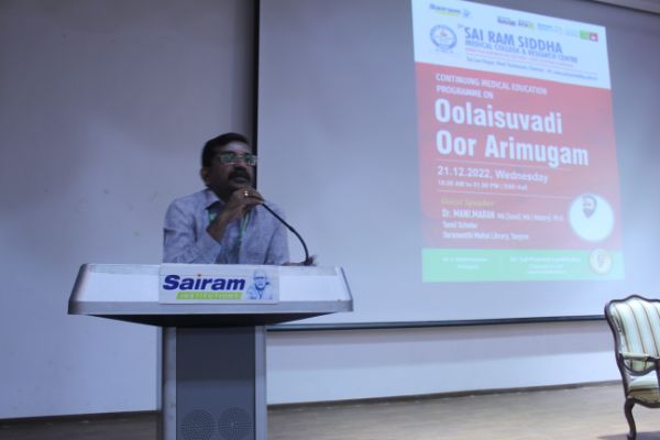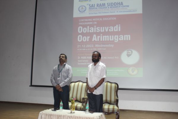 Sri sairam siddha medical college and research centre conducted a CME on the title Olaisuvadi oor arimugam on 21.12.22. at SSR Hall . Our chief guest Dr.Mani.Maran ,Tami scholar , Saraswathi mahal Library, Tanjore shared many valuable points insisting the heritage of Tamil culture mentioned in the olaisuvadigal.
