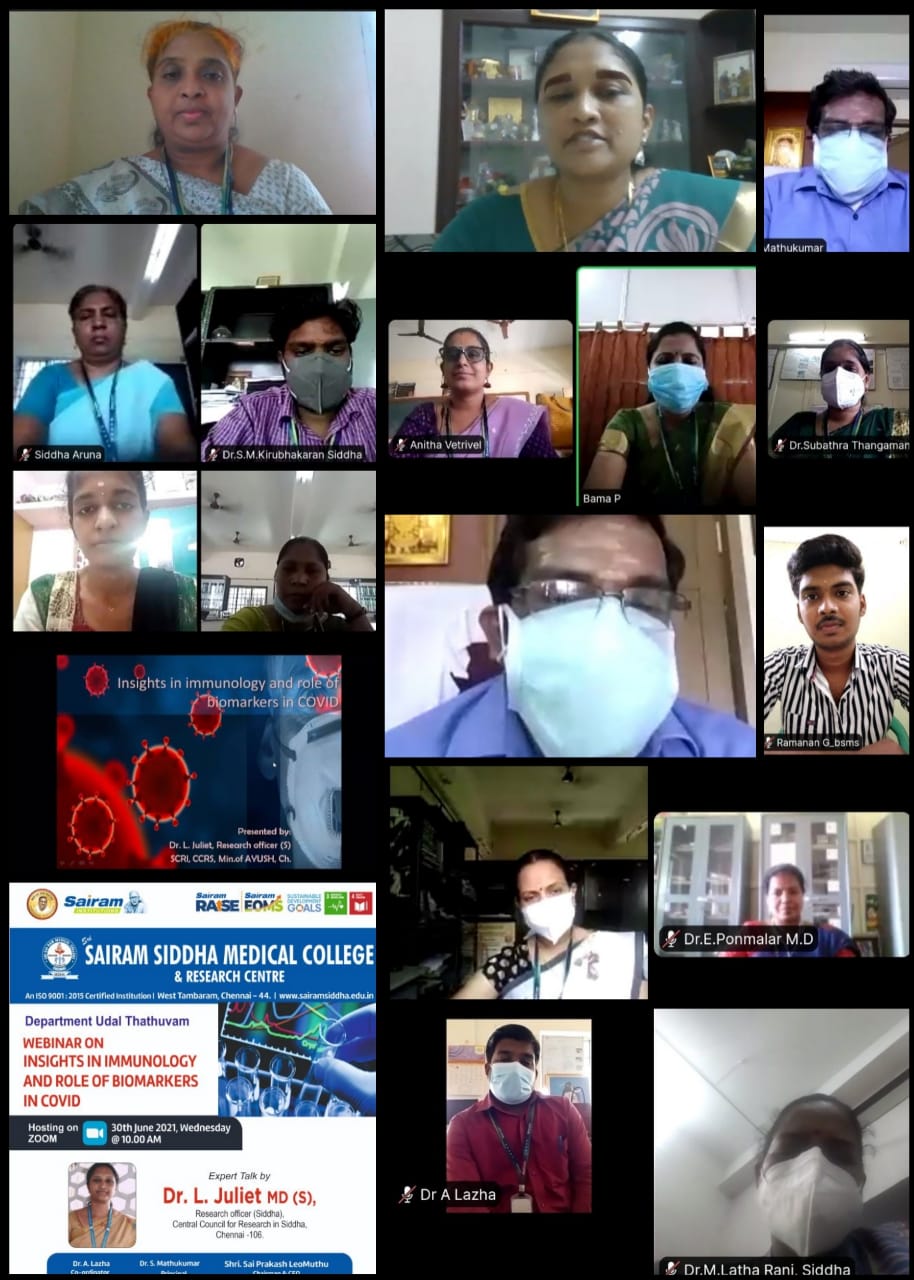 We the Department of Udalthathuvam presented a webinar on Insights of immunology and Role of biomarkers in covid by Dr.L.Juliet M.D(S), Research officer, Siddha Central Research Institute, CCRS, Chennai. We would like to express our gratitude to our CEO Sai Prakash Leomuthu sir, CBO R.Sathish Kumar sir and our beloved Principal Prof. Dr.S.Mathukumar. We also thank DR.Bama, other faculty members and our students who made this webinar a success.