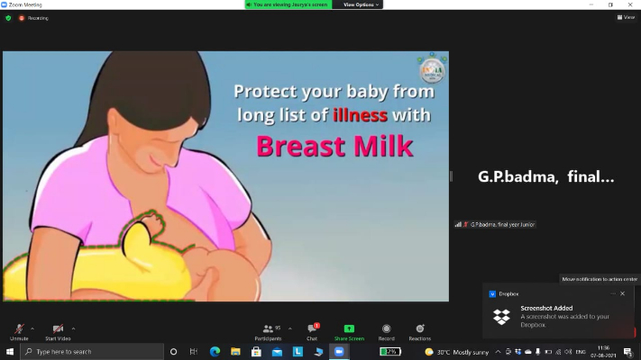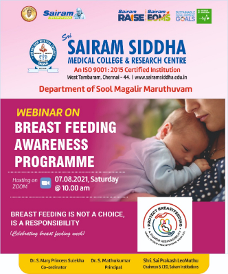 On behalf of Sri Sairam Siddha Medical College & Research Center, Department of Sool Magalir Maruthuvam conducted a Breast Feeding Awareness Webinar. We would like to express our thankfulness to our CEO Sir, CBO Sir, Principal Sir, faculties and students who made this programe successful.